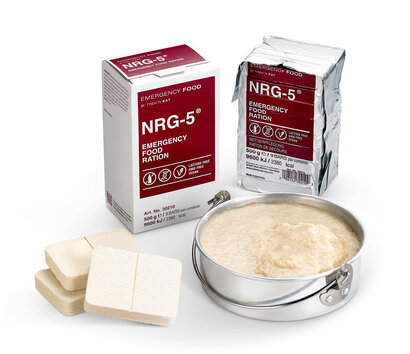 NRG-5® emergency food rations, fortified with high quality ingredients. A pack of NRG-5® (500g / 2300 kcal) covers the daily energy requirements of an adult. Ready-to-eat, no heating or boiling required. Can be given to children as of 6 months old. By crushing the compressed bars and adding water, you can prepare a nutritious mash or an energy drink, depending on how much water you add.