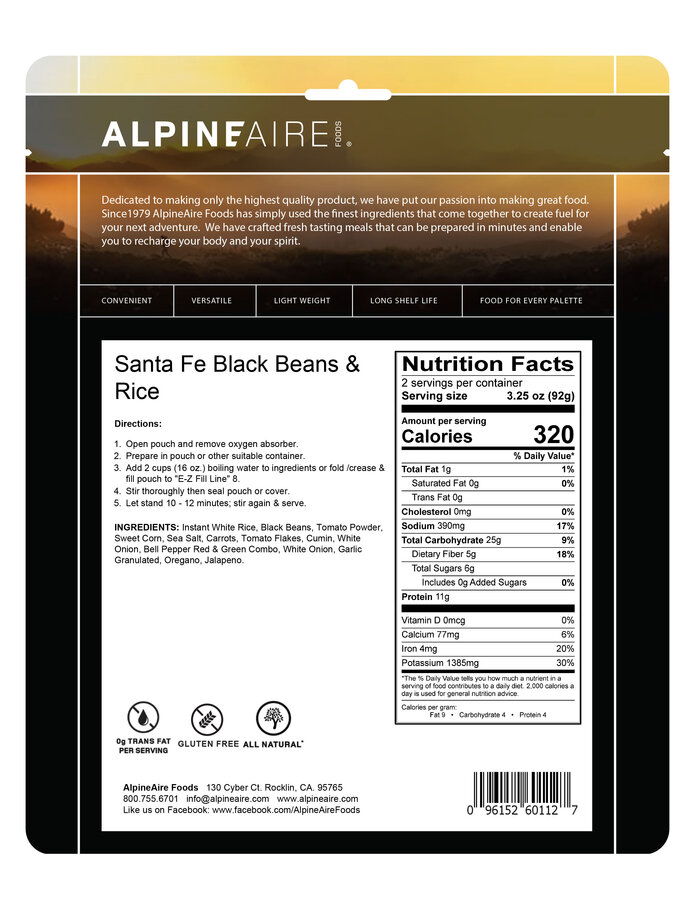 Black beans & rice with a zesty southwest flavor; with corn, carrots, red & green bell peppers, onion, garlic & a mild jalapeno touch. Gluten Free.