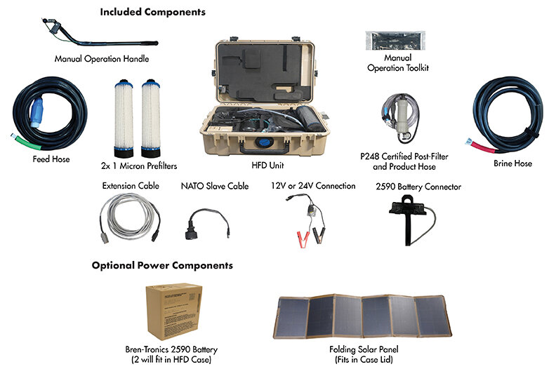 The HFD is a portable water system that delivers purified drinking water from virtually any source, including fresh, brackish, or seawater.