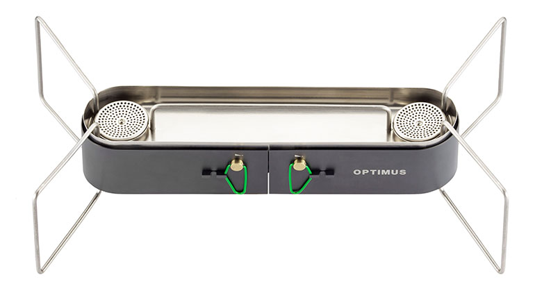 High performance, a trailblazing lightweight construction made of durable, high-quality materials, and a patented compact design are the hallmarks of the new OPTIMUS Gemini Double Burner. Ideal for simultaneously preparing different meals, rapidly boiling water, or constant simmering for several hours, the OPTIMUS Gemini brings new flexibility to outdoor cooking. Two hand controls allow the flame height to be infinitely varied separately for each burner head, while the integrated pressure control valve stabilizes the flame throughout the cooking process. This allows for precise cooking with efficient energy consumption. Raised edges protect the flames from wind and fold-out legs on both sides ensure optimum stability even when using large pots. Its small footprint and light weight make the OPTIMUS Gemini the ideal companion for any outdoor adventure where delicious food is a priority.