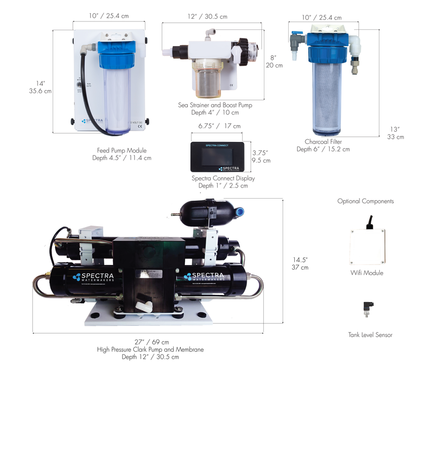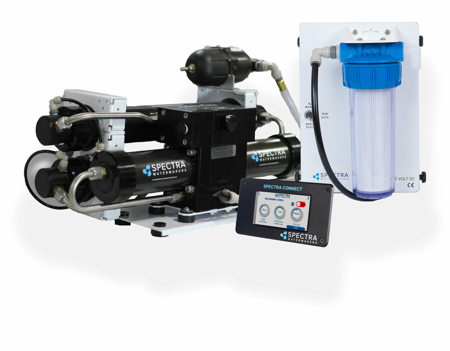 The new Catalina 340c Compact produces 14 gallons (53 liters) of water per hour, making it the perfect watermaker for the midsize yacht with two to four people onboard. The Catalina uses the Spectra Magdrive feed water pump, making the system extremely quiet, energy-efficient, and reliable. The Spectra Connect allows you to operate and monitor your watermaker from a remote device, and has new added features like the Fill Tank mode, or a customizable Auto Run mode, One-TouchSensor Calibration, and suggested maintenance intervals displayed on the dashboard. Two 20” membranes are utilized in the 340c Compact model for maximum space efficiency.
