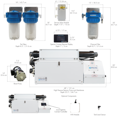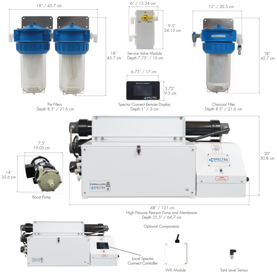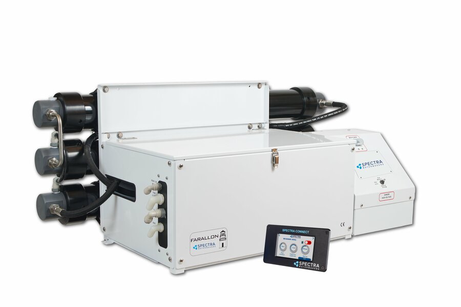 The Farallon systems are designed with Spectra’s unique Pearson Pump technology for unrivaled reliability, energy efficiency, and durability and feature the Spectra Connect Controller. The Spectra Connect allows you to operate and monitor your watermaker from a remote device, and has added features like the Fill Tank mode, or a customizable Auto Run mode, One-Touch Sensor Calibration, and suggested maintenance intervals displayed on the dashboard, taking the guesswork out of operation and upkeep! The slow-moving pumps mean less maintenance, longer, quieter, trouble-free operation. The Farallon’s variable frequency drive motor controller ensures soft starts with no massive inrush current to crash your inverter or generator at startup. Powered by 110v or 220v AC, these systems bring municipal scale desalination plant features to your fingertips.