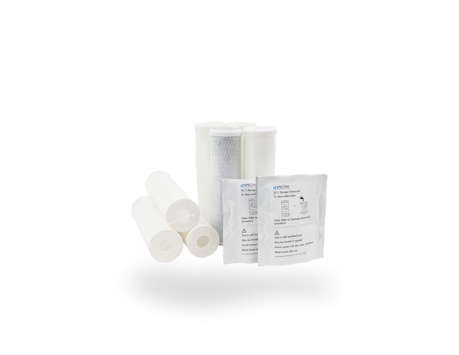 This kit includes six 5 micron filter elements, one charcoal filter element, and two bags of SC-1 storage chemical. This kit is compatible with the Ventura 150, Ventura 150 Ocean Rowing, Cape Horn Extreme 330, Catalina 340 Z, and older units such as the Spectra 180C, 200C, 380C, and Catalina 300 MKII.