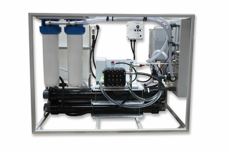 The LB 2800 F is an analog desalination unit that is built using the patented Spectra Pearson Pump™ which allows for energy efficiencies comparable to large scale industrial desalination plants. The LB 2800 F is a turnkey solution producing 120 gallons/hour (444 Liters/hour) of fresh potable water from fresh, brackish or seawater sources. These units are available with an optional custom built pc board controller for fully automated operation. The LB 2800 F systems are completely integrated into a stainless steel frame and factory tested to rigid performance specification.The Pearson Pump™ is a breakthrough in pump design, combining a high-pressure piston pump with built-in energy recovery. The energy normally wasted in the high-pressure brine stream is recovered, saving up to 75% of the power required for a standard reverse osmosis system. The Pearson Pump’s™ “hydraulically locked” recovery rate allows the system to produce the full rated volume of water from virtually any water source, without the user making any changes to the system. Standard systems require operator adjustments as the pressure changes, but our fixed recovery rate system eliminates the need for operator input and prevents membrane damage.The LB 2800 F is contained within a rugged 304 powder coated stainless steel frame, pre-plumbed and tested with all components. It includes is a built-in permeate flush tank which doubles as a clean in place tank by simply turning the service valves.All landbased systems require a low pressure feed pump (not included) based on your site specific requirements. Depending on the quality of the feed water available on your site media filters may be also be required to allow the prefilters to last for a reasonable amount of time.